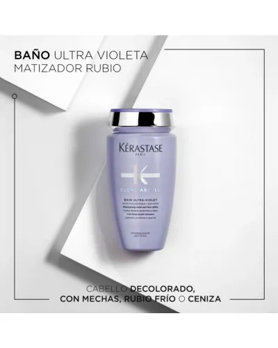 Champú: Elimina los tonos amarillos de tus cabellos rubios. El champú Bain Ultra-violet cuida en profundidad los cabellos rubios, hidratándolos y proporcionándoles un brillo muy natural. Además, gracias a los filtros ultravioleta de su formulación, elimina los tonos amarillos. Es un champú ideal también para cabellos blancos o con canas, ya que consigue limpiar e intensificar su luz natural.