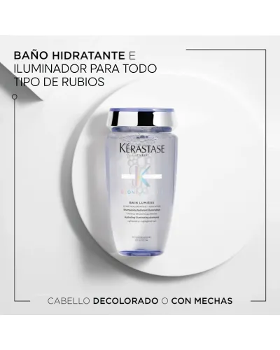 Champú: Consigue tu rubio ideal. El champú Bain Lumière es perfecto para hidratar e iluminar todo tipo de cabellos rubios. El cabello se presenta ligero y suelto a la vez que hidratado. Además, este champú consigue proporcionar un brillo natural a los cabellos rubios, ya sean naturales, teñidos o con mechas. El cabello rubio teñido o decolorado vuelve a recuperar su vitalidad y luz natural.