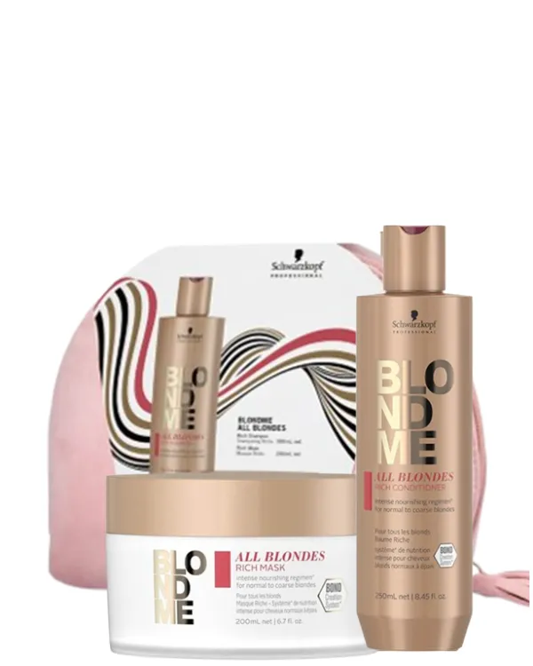 Para un cabello rubio nutrido y con un color intenso, este set de Regalo de la Gama Enriquecida para Todo Tipo de Rubios de BLONDME. Cabello normal a grueso