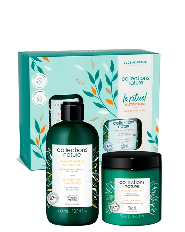 El Pack Ritual Nutrición Collections Nature de Eugene Perma Professionel es una solución profesional y natural para cabellos dañados, rizados o encrespados que necesitan reparación y nutrición profunda.