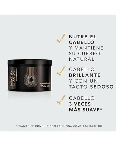 Mascarilla: Luce cabello sedoso, brillante y con cuerpo. La mascarilla Dark Oil es una mascarilla ligera que aporta sedosidad y luminosidad a cualquier tipo de cabello. Es perfecta incluso para ser aplicada en los cabellos más finos, ya que proporciona cuerpo al cabello.
