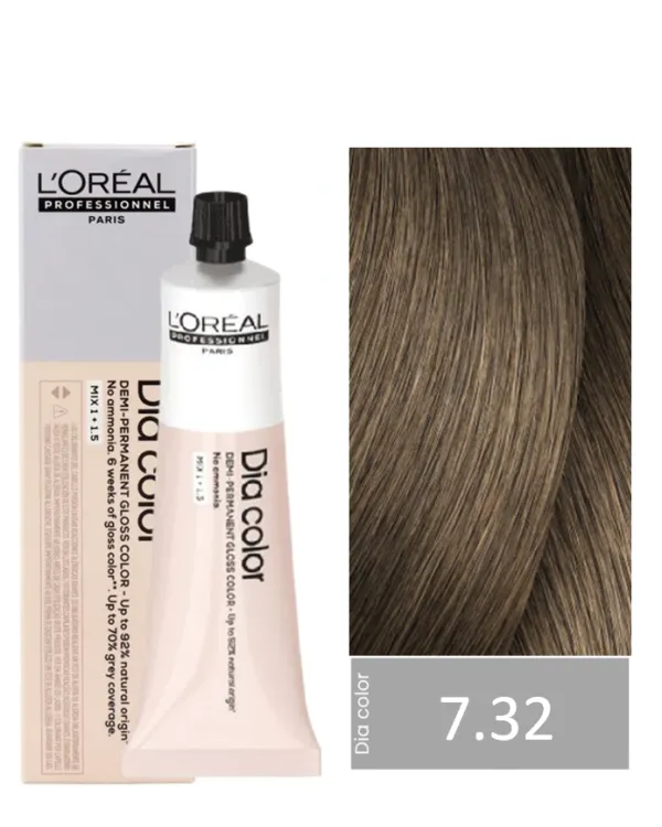 - Dia color es una coloración alcalina demi-permanente sin amoniaco para conseguir un color gloss. Revierte los efectos de la pérdida de melanina durante 6 semanas de color gloss y cubre hasta un 70% de los cabellos blancos. Proporciona x3 más brillo y reaviva el color del cabello. La textura es en crema para facilitar la mezcla, aplicación y enjuague. Dia color restaura el color y brillo con la tecnología de relleno de la melanina perdida, que replica el color de la melanina y rellena los huecos de melanina perdida. Su fórmula contiene hasta 92% de ingredientes de origen natural.