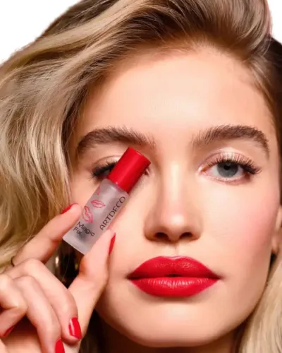 Como por arte de magia, el fijador de barra de labios evita que la barra de labios se desplace y la hace resistente a los besos y al agua. El color original de la barra de labios no se altera y también conserva un ligero brillo.