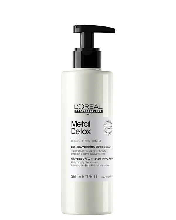 Tratamiento pre-champú Metal Detox Professional rellena un millón de microfisuras en un solo uso. Está concentrado con un 2% de glicofiller y tiene eficacia probada en todo tipo de cabello.