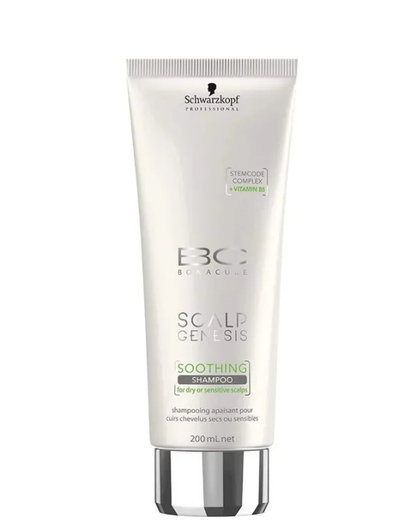 BC SCALP GENESIS soothing shampoo de Schwarzkopf. Champú calmante para los cabellos secos y sensibles. Limpia el cabello con suavidad y de forma eficaz. Contiene vitamina B5 que le aporta hidratación al cabello y le ayuda a equilibrar la hidratación del cuero cabelludo y el cabello y StemCode. Aplicar sobre el cabello mojado, masajear y aclarar.