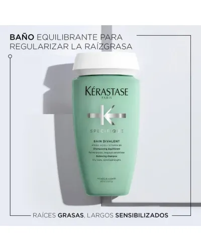 Evita las raíces grasas durante más tiempo. El Bain Divalent es un limpiador en profundidad que regula la aparición de raíces grasas, proporcionando un cuero cabelludo equilibrado y purificado. Además, contribuye a que las fibras capilares recuperen su suavidad, flexibilidad y brillo natural gracias a su acción nutriente e hidratante, focalizando la atención en las zonas sensibilizadas y en las puntas secas.
