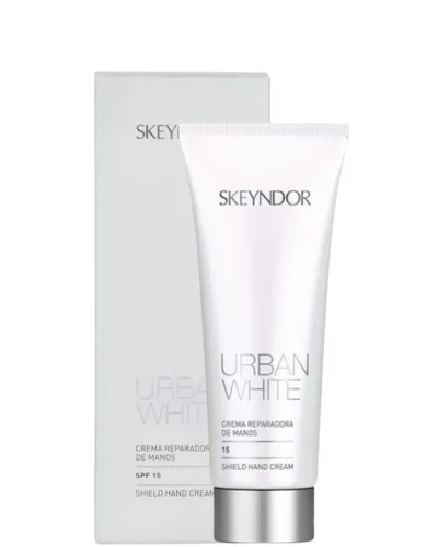 Crema reparadora de manos Shield Hand Cream 75ML Urban White SkeyndoR Fórmula de tratamiento para manos envejecidas y con manchas. Esta crema de manos contiene tres activos dirigidos a unificar el tono de la piel, redensificar su aspecto y contrarrestar los daños estéticos derivados del sol y el tabaquismo (alquitrán, tóxico, etc. Con factor de protección solar FP15.
